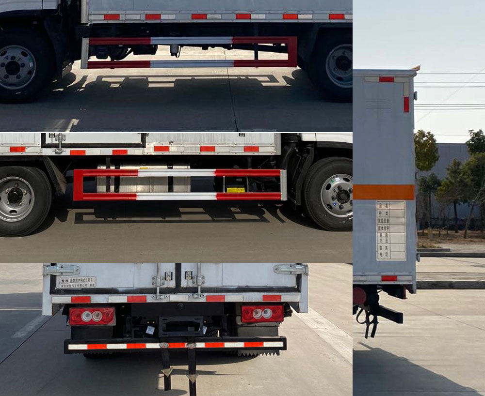 配置  該車為危險品運輸車,運輸具有**容器(瓶)包裝的物品,運送危險物品類項號:4.1,4.2,4.3。廂體頂部封閉,不可開啟。側后防護材料均為Q235,螺栓連接,后防護截面尺寸(mm)100×50,下邊緣離地高450mm。選裝后部尾板,選裝后部尾板時后防護材料為Q235,螺栓連接,截面尺寸(mm)φ100,下邊緣離地高450mm。廂體選裝側開門及位置或無側門、選裝后門雙拉桿,廂體選裝瓦楞板結構,選裝百葉窗。僅選用排氣管前置、限速裝置(限速80km/h)、前輪盤式制動及子午線輪胎的底盤;轉向輪裝備輪胎爆胎應急防護裝置。安裝帶有衛星定位功能的行駛記錄儀。ABS型號/生產廠家:ABS-E/威伯科汽車**系統(**)有限公司,ABS-VI·E/廣州瑞立科密汽車電子股份有限公司,YF8/武漢元豐汽車電控系統有限公司。發動機/油耗值(L/100Km)對應關系為: F2.8NS6B131/11.47,Q28-130E60/11.02。尾板收起狀態水平長度為280mm,尾板質量為350kg。選裝ETC。