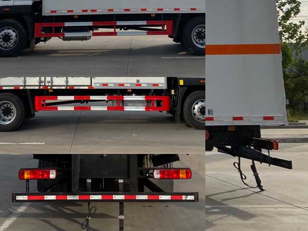 ABS型號:ABS-E,ABS/ASR-24V-4S/4M,CM4XL-4S/4M,3550D-1010;ABS生產(chǎn)企業(yè):威伯科汽車控制系統(tǒng)(中國)有限公司,東科克諾爾商用車制動系統(tǒng)(十堰)有限公司,廣州瑞立科密汽車電子股份有限公司,東科克諾爾商用車制動系統(tǒng)(十堰)有限公司;安裝有限速裝置;限速裝置限速(km/h):80;安裝有具有衛(wèi)星定位功能的行駛記錄儀;選裝描述:選裝側(cè)門型式及位置,選裝側(cè)門數(shù)量,選裝不開側(cè)門,廂體側(cè)面板選裝開百葉窗,選裝瓦楞板結(jié)構(gòu).該車型可選裝ETC車載裝置;發(fā)動機/油耗值(L/100km)對應(yīng)關(guān)系為:F4.5NS6B220/24.4,B6.2NS6B210/26;側(cè)后防護情況:側(cè)、后防護材料均為Q235,螺栓連接,后防護截面尺寸120×70mm,下邊緣離地高450mm;車廂頂部封閉且不可開啟;運輸獨立容器(瓶)包裝的貨物;危險貨物類項號:第3類;其他說明:僅選用排氣管前置、前輪盤式制動及子午線輪胎的底盤.該車轉(zhuǎn)向輪安裝輪胎爆胎應(yīng)急防護裝置,后軸采用空氣懸架.該車為危險貨物運輸車。選裝后尾板時,后防護材料為Q235,焊接,截面尺寸120×50mm,下邊緣離地高450mm。尾板收起狀態(tài)水平長度為290mm,尾板質(zhì)量為550kg。隨底盤選裝駕駛室;選裝燃油箱,電瓶,尿素罐,后處理,儲氣筒左右安裝位置。