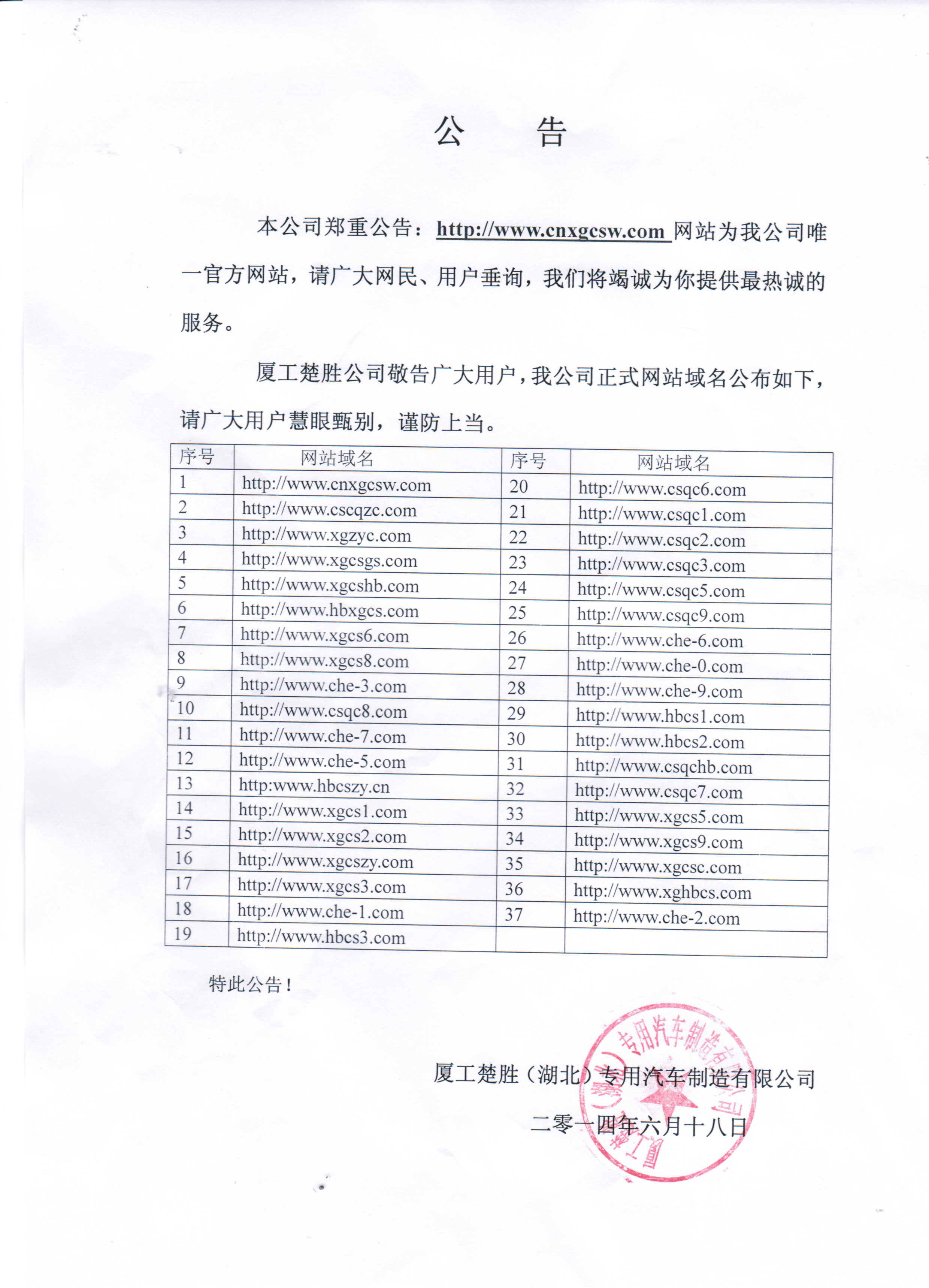 廈工楚勝公司敬告廣大用戶,我公司正式網站域名公布如下,請廣大用戶慧眼甄別,謹防上當。