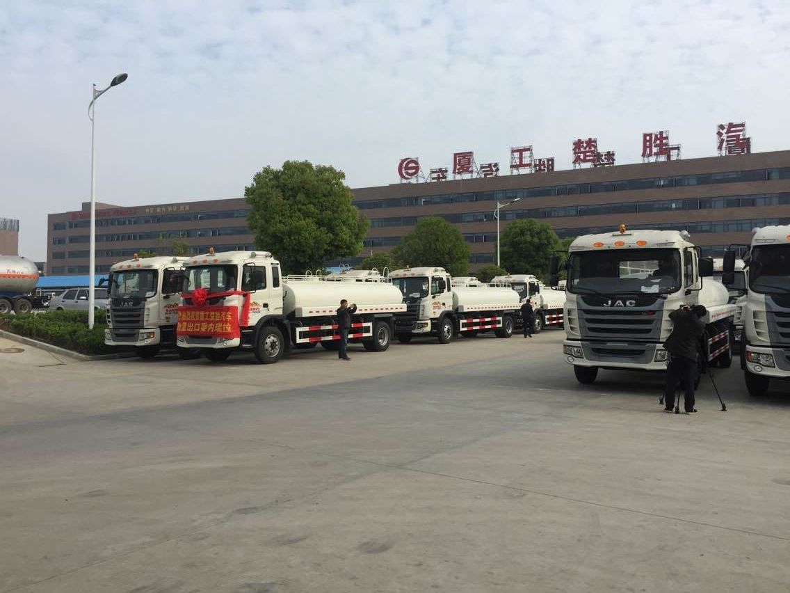 2015年4月24日,在湖北隨州廈工楚勝公司辦公樓前50輛運水車整裝待發,準備出口到委內瑞拉。