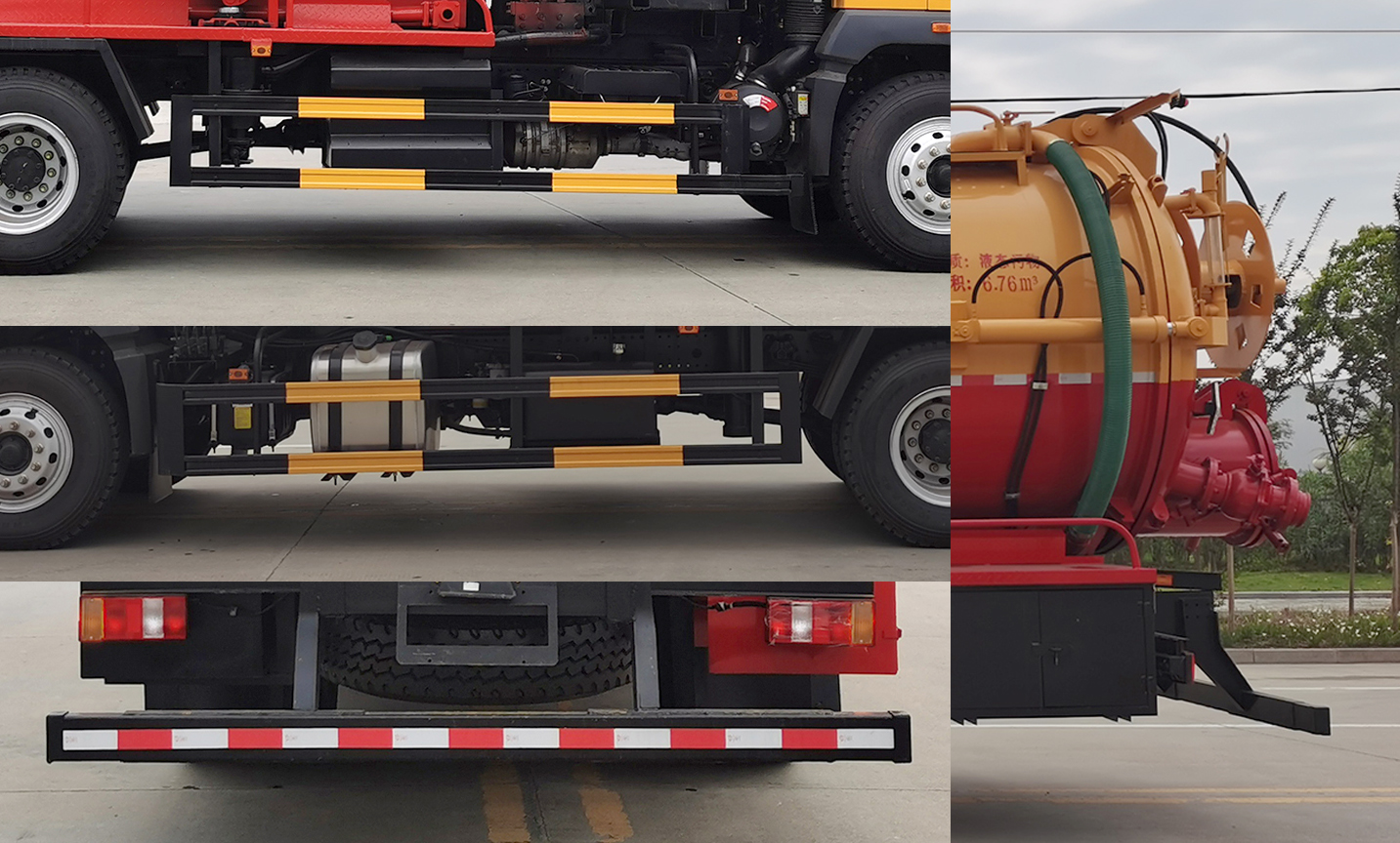 配置  ABS型號:XH-KQ4S4M-E01,CM4XL-4S/4M;ABS生產企業:廣州市西合汽車電子裝備有限公司,廣州瑞立科密汽車電子股份有限公司;選裝描述:隨底盤選裝駕駛室;側后防護情況:側/后防護材料為冷彎型鋼/Q235,焊接;后防護截面尺寸120×50mm,下邊緣離地高500mm;罐體有效容積(立方米)、罐體外形尺寸(mm):罐體尺寸為(直段長×直徑)(mm):4700×1950,其中罐體前段為清水罐(直段長2040mm);后段為污水罐(直段長2660mm)。污水罐有效容積6.76立方米;清水罐有效容積5.41立方米;專用功能及裝置:該車用于下水道清洗或吸污,主要專用裝置為吸污裝置總成、清洗裝置總成;其他說明:僅采用軸距(mm):4700。兩罐不能同時滿載;選裝前面罩。卸料方式為舉升后卸式。