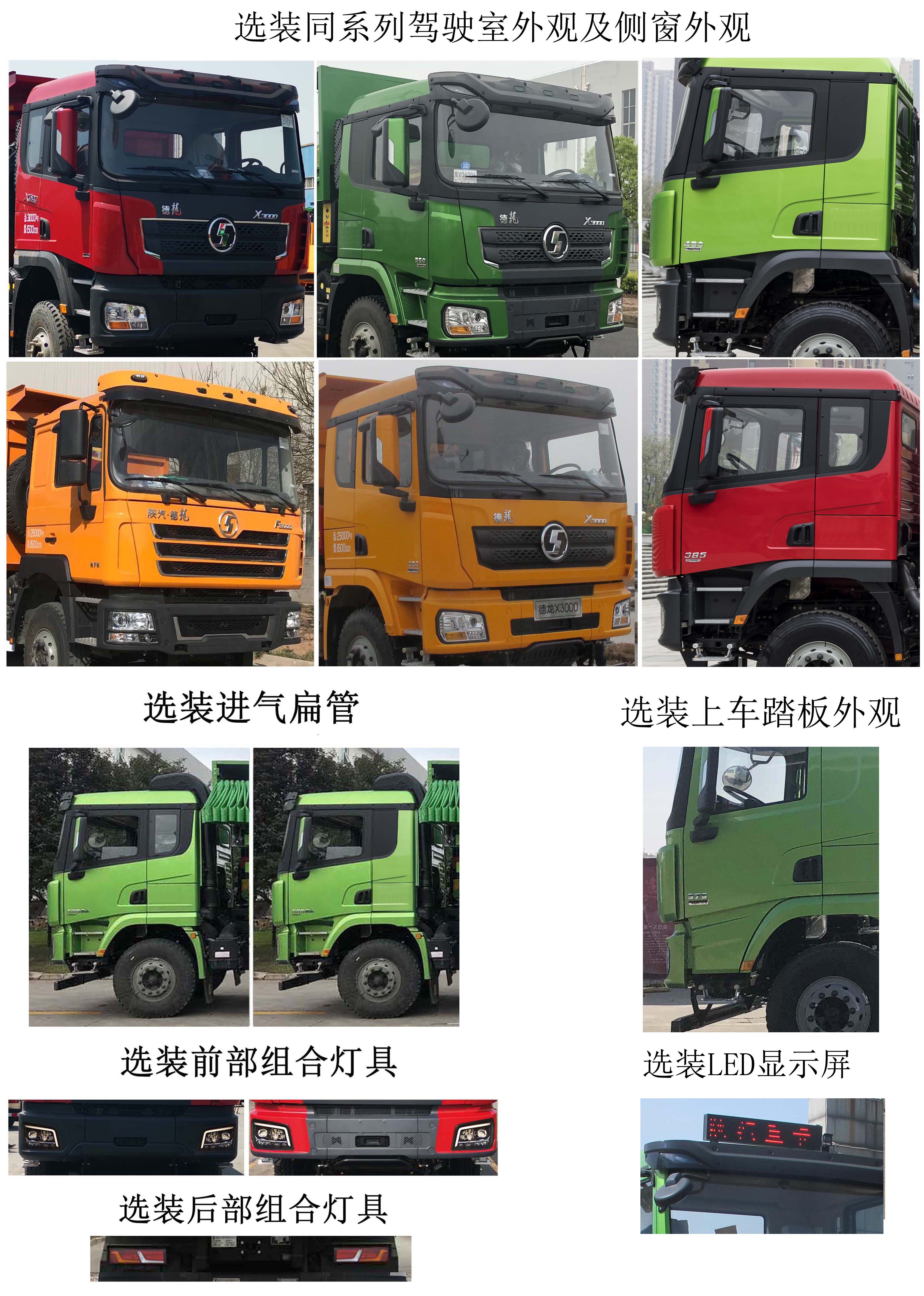 配置  1.在軸距為3975+1400底盤上改裝.整車長度/貨箱/后懸對應關系為:8550/5600/1650,8750/5800/1850;2.隨底盤選裝同系列駕駛室,LED顯示屏,前后組合燈具.3,該車自卸方向為后翻.4,選裝貨箱欄板外觀,環保折疊篷布.環保蓋.5.側后防護所用材料:Q235;連接方式:螺栓連接;后防護斷面寬度(mm):50×120;后防護離地高度(mm):440.4,安裝帶衛星定位功能的行駛記錄儀.6,ABS系統生產廠家及型號分別為:西安正昌電子股份有限公司(型號:ZQFB-V).7,裝WP12.400E62、WP12.430E62、WP12.460E62、X12NS6B360、X12NS6B385、X12NS6B400、X12NS6B430、X12NS6B440、X12NS6B460、X12NS6B470、X12NS6B490發動機時油耗申報值均為37.4L/100km.8,選裝進氣扁管位置,選裝保險杠.